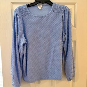 Chic light blue blouse with textured design. Long sleeves and elegant style. Perfect for versatile wear.