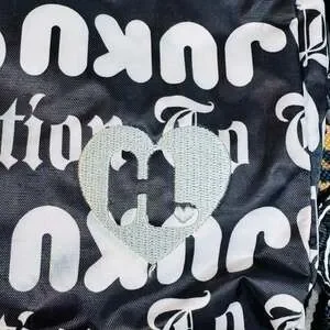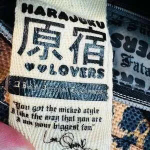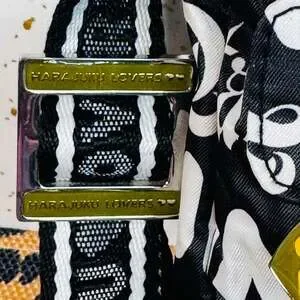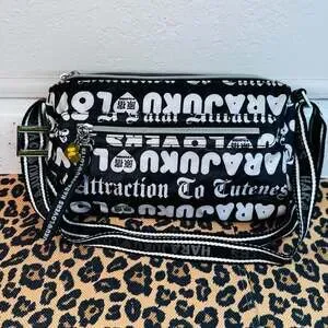 Vintage Harajuku Lovers 'Fatal Attraction To Cuteness' crossbody messenger bag, black and white logo print — Rare Gwen Stefani Y2K original. This skimmable and stylish piece features the iconic bold typography and 'Fatal Attraction To Cuteness' graphic. Included are signature details like the 'H' heart charm, adjustable branded shoulder strap, and interior quote tag signed by Gwen. Made from durable nylon-style material with multiple zipper compartments for organization. Good pre-owned vintage condition. Shows light signs of wear consistent with age but no major flaws. Perfect for collectors of 2000s Harajuku fashion.