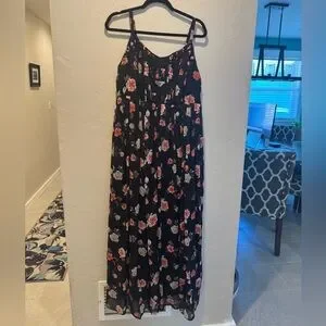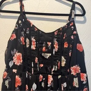 Stylish black dress featuring a vibrant red and white floral pattern. Perfect for any occasion.