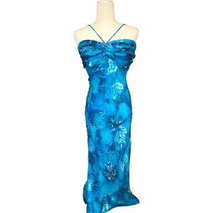 Y2K Vintage Cache Silk Floral Gown dress Blue Criss Cross Halter Size 6