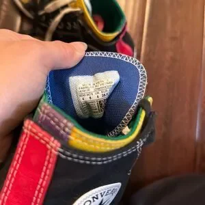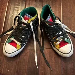 Double laced, double tongue, rainbow converse sneakers. Unique spin on the basic black converse