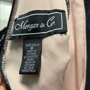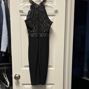 Morgan & Co. Black Lace and Nude Illusion Halter Cocktail Dress.