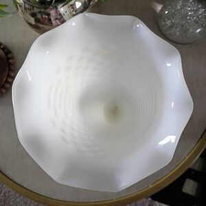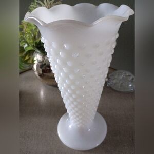 Vintage White Milk Glass Footed Vase, Ruffled Edge Hobnail Dots, 9.5 inch