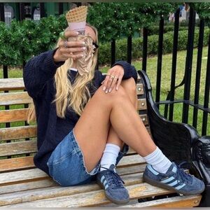 Classic Adidas Spezial sneakers. Dark blue with light blue stripes. Comfortable and stylish for everyday wear.