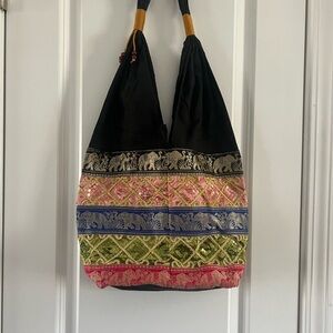 This vibrant women's bag features intricate embroidery in black, pink, green, and gold. Perfect for adding a pop of color to any outfit. Boho style