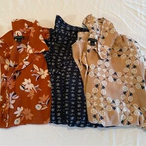 Lot of three (3) stylish blouses by Ann Taylor Factory. Features floral and geometric patterns. Ideal for any occasion.