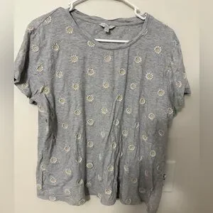 Chic gray tee with floral pattern. Comfortable short sleeves. Perfect for casual outings.