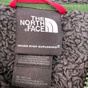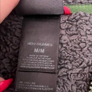 Olive green jacket with black accents. Features a zippered chest pocket. Ideal for outdoor activities.