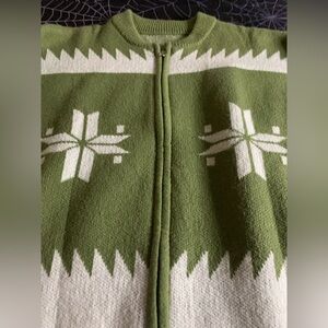 Green full-zip knit holiday sweater cardigan,white snowflake & geometric motifs