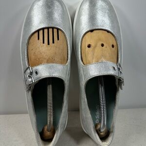 Stylish silver Mary Jane platform shoes with buckle detail. Perfect for casual wear.
