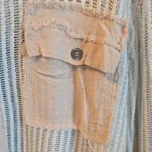 Chic cream button-up with textured fabric. Features front pockets and casual style.