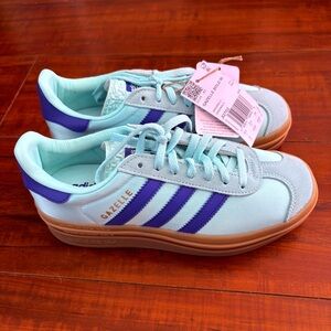 adidas gazelle bold, gazelle platform, women’s adidas sneakers, pastel sneakers, light blue adidas, purple stripes, gum sole shoes, retro adidas, Y2K sneakers, streetwear shoes, casual lifestyle sneakers, originals gazelle.