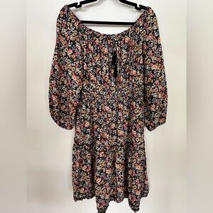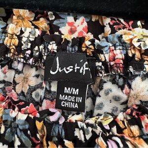 Justify floral dress, floral mini dress women, puff sleeve mini dress, smocked waist dress M, off shoulder floral dress, scoop neck tie front dress, tiered mini dress, lightweight summer dress, casual boho dress, cottagecore floral dress, romantic mini dress, festival summer dress, vacation outfit dress, everyday feminine dress.