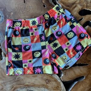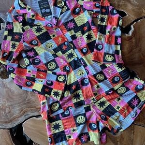 Vibrant button-up shirt with a playful graphic pattern. Features a mix of colors including black🎱, pink🩷, yellow 💛 and orange 🧡 . With big Smiles 🙂 and 8 balls 🎱.
