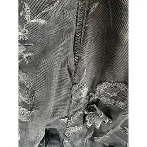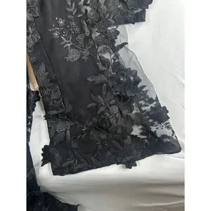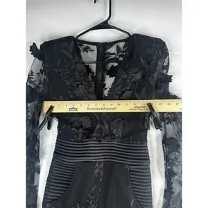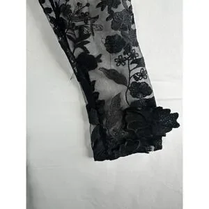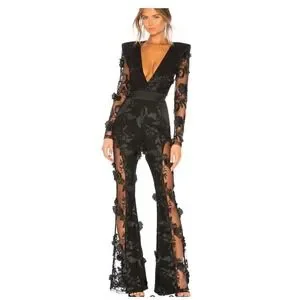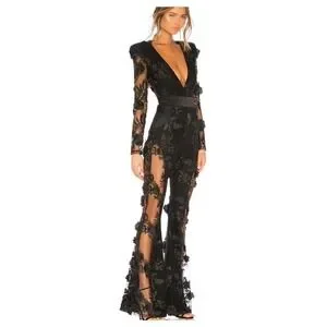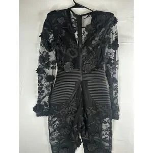 Please note there are two small holes underneath the zipper on the back. Someone tried it on and it didn't fit them. This should be very easy to repair. Priced as reflect that. Black floral lace jumpsuit features a dramatic deep V-neckline and long sheer sleeves with intricate 3D floral appliqués. The bodice is accented with structured padded shoulders and a wide, ribbed waistband that transitions into textured hip panels. Sheer lace legs with a slight flare create a bold, sophisticated silhouette, while a full-length back zipper ensures a secure fit.