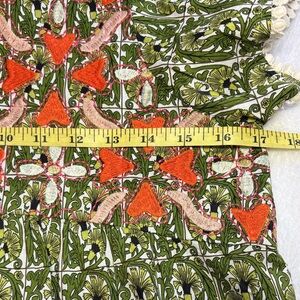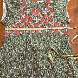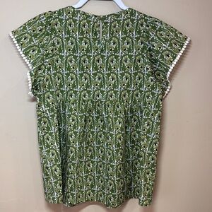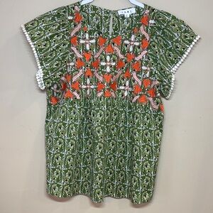 Vibrant green blouse with intricate embroidery. Features green and orange patterns. Matching button at the back keyhole opening. Pretty trim on the flutter sleeves.