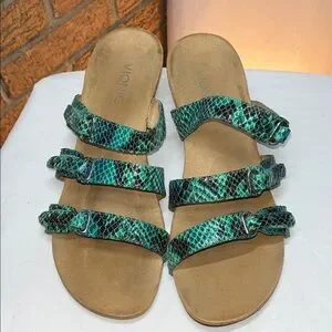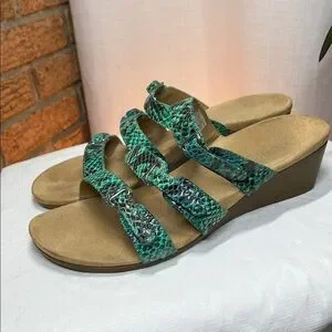 Vionic Dwyn strappy wedge slide sandals green snakeskin print 9