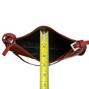 Chic baguette-style shoulder bag features a glossy faux-crocodile embossed texture in a deep burgundy red. Designed with a sleek, slim profile and a top zip closure, it includes a matching adjustable shoulder strap with silver-tone buckle hardware. The interior is lined in black fabric and provides enough space for daily essentials like a phone, wallet, and keys. Authentic Y2K, proved condition. Some evidence of use on interior as shown in pictures.