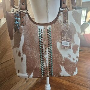 Stylish cowhide bag featuring a unique brown and white pattern. Perfect for adding a rustic touch to any outfit.