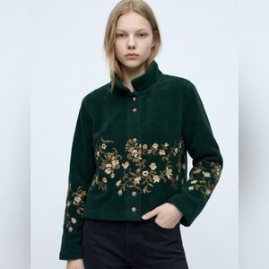 Vintage green fleece jacket with intricate gold embroidery and gold button details. Perfect for adding a touch of sophistication to any outfit.