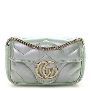 Introducing the Gucci Iridescent Nappa Chevron Matelasse Super Mini GG Marmont Shoulder Bag in Snow Light Blue. This exquisite piece features a stunning chevron matelassé design crafted from iridescent nappa leather, exuding elegance and style. The iconic GG Marmont emblem adds a touch of luxury to this compact yet versatile accessory.