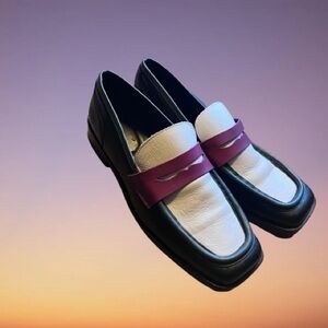 Step up your shoe game with these modern, architectural loafers from Maeve (Anthropologie). These aren’t your average flats—they feature a bold, color-blocked design in crisp white and classic black, accented by a vibrant pop of purple. The sleek square toe and Made in Spain craftsmanship give them a high-end, designer feel that elevates any outfit.