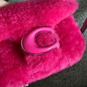 Brand new, never used. Light fuchsia (bright pink) shearling bag with silver hardware, same color leather crossbody strap. Removable shearling top handle. The signature Tabby “C” clasp is wrapped in leather with silver trim—super adorable. Fits credit cards inside (one slip pocket), cash, lipstick…doesn’t fit standard iPhone but could maybe fit a flip phone? Check measurements in second to last photo to see if it would work for you.
