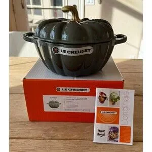 Le Creuset Enameled Cast Iron Pumpkin Cocotte 4 qt Thyme Green Gold Knob NEW