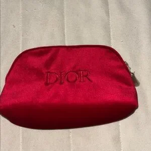 Elegant red velvet Dior cosmetic bag with gold zipper. Perfect for travel or daily use. Stylish and compact.