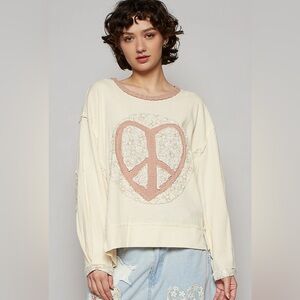 Stylish cream hoodie with a pink peace sign. Ideal for laid-back days. Perfect for the transition from winter to spring.