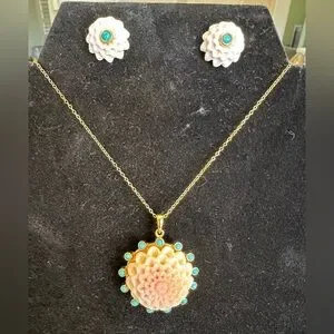 Carved Pink Conch Shell and Sleeping Beauty Turquoise Pendant and Earrings