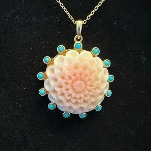 25mm Round Carved Pink Conch Shell with 2mm Round Sleeping Beauty Turquoise, 18k Gold Over Silver Pendant with 18" Cable Chain. Measures approximately 1.55"L x 1.22"W 2.5mm bail. Spring Ring Clasp