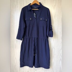 Boston Proper dress XL navy shirt dress utility dress gold snap pockets drawstring waist roll tab sleeves knee length work dress casual office travel dress polished everyday style structured silhouette contemporary womens fashion