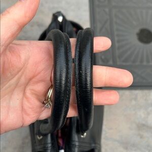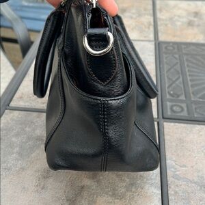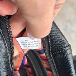 100% genuine leather handbag. Silver hardware. Leather is textured slightly. Silky striped interior lining. Outer pockets and inner pockets. One outer side pocket has a little staining on the inner liner at the bottom. See last photo. Otherwise, in excellent condition!