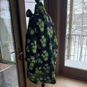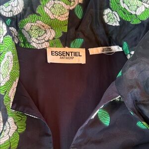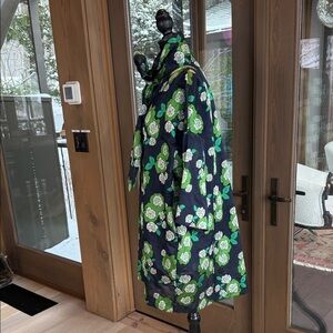 Fun mini dress featuring a striking floral pattern. Perfect for wearing as a mini dress or layering over pants. Sash can be tied a number of ways. Dress is lined and has pockets. The size and care instructions tag is removed, but it fits like a boxy medium measuring 21 inches across the shoulders, 28 inches from armpit to armpit, and 34 inches long. Purchased at the Essential Antwerp boutique in Amsterdam. Retail $495.