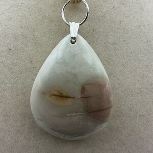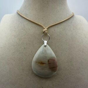 Light colored polychrome jasper teardrop pendant. Pendant is 1.5” tall and 1 1/4” wide. It’s on a tan waxed nylon adjustable rope cord with two woven sliders to increase or decrease length. Can be as long as 25”. Pendant is on a silver tone bail and jump ring. The pendant is an off white color with some light red and yellow patterns. Also has some bronze and grey striping. It looks like a sunset or some kind of skyline.