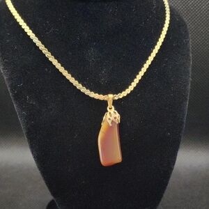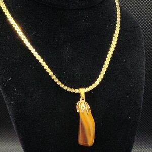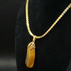 This stunning necklace features a gold chain with a unique brown pendant. Perfect for adding a touch of elegance to any outfit.