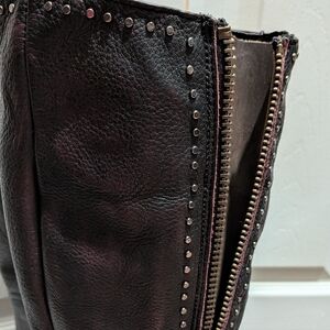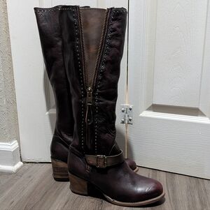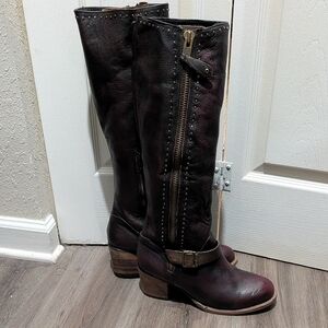 I CAN'T ACCEPT YOUR OFFER IF YOU DON'T SEND ONE! NEW Freebird Carson Genuine Leather Tall Boots Sz 11 Deep Wine Burgundy & Brown. These boots are in new condition without box but DO come with dust bags as pictured. Color is a deep wine burgundy bordering on brown with brown accents along with studded trim and buckles. They have an insert on the outer zipper making them an adjustable fit for wide calves (wide fit) or to give flexibility if wearing as an OTK boot. See measurements below. They do fit as a true 11 or possibly 10 with thick socks. I absolutely love them but I've never worn them and they deserve a good home.