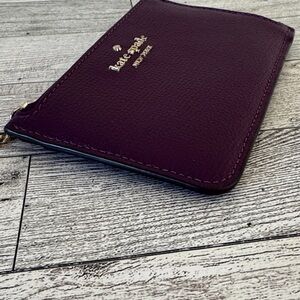 Kate Spade Darcy Medium L Zip Purple Leather Card Holder. Features gold tone hardware with key ring, 4 exterior card slots, small exterior pocket and zippered interior compartment. Excellent condition with minor tarnishing on keyring. Measures 5" x 3.5"