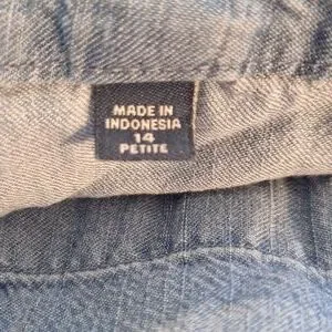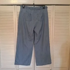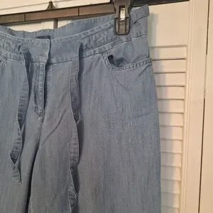 Stylish wide-leg jeans in denim blue. Perfect for casual wear is a day at the beach. very lightweight and comfy. bottom zipper and clasp closure waist with drawstring also. front and back pockets. size is 14 petite. waist is 16, rise is 10, inseam is 27, leg width is 11. excellent condition