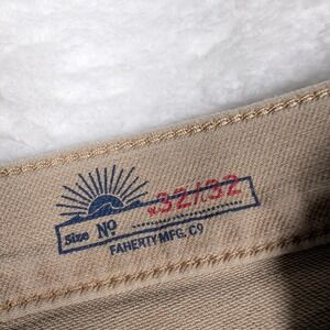 Label details: Back waistband features a brown faux leather patch debossed with Faherty Brand and sunrise wave graphic; interior waistband print shows the same sunrise logo with size 32/32 and Faherty Mfg Co text; front metal button is engraved with Faherty Mfg Co USA; a small woven tab with sunrise logo is sewn at the back pocket.