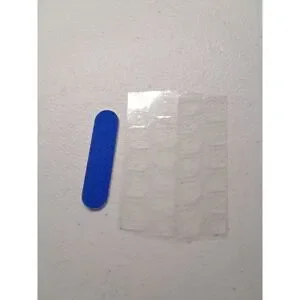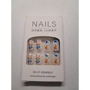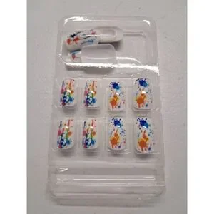 DIY press-on nail kit features a vibrant multi-color paint splatter design over a clean white base for a bold, artistic look. These square-shaped nails offer a natural, delicate fit and are designed for quick application in just 2 minutes. The set includes a variety of nail sizes along with a blue mini nail file and a sheet of adhesive tabs, providing everything needed for a complete professional-style manicure at home.