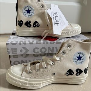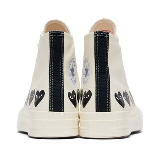 High-top sneakers with iconic heart logo. Beige canvas with black accents. Converse collaboration.
