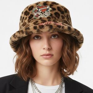 Fuzzy Ed Hardy hat featuring a striking leopard pattern. Embroidered design adds unique style.