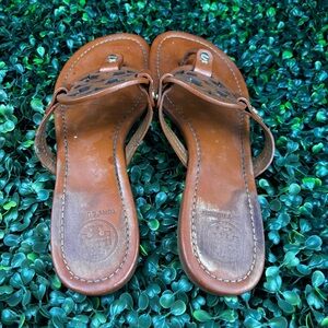 TORY BURCH Thong Sandals Chic brown leather sandals with intricate stitching. Perfect for any occasion.
