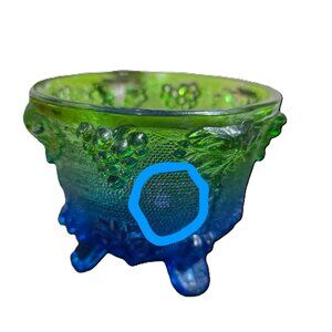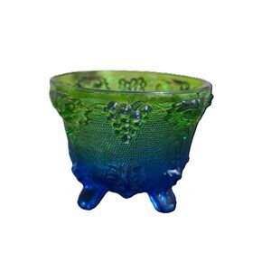 Vintage 1970's Candy Dish 2-Tone Blue & Green Glass Grape Pattern Footed