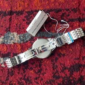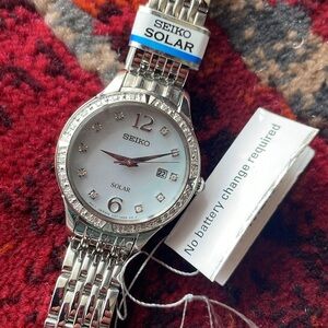 A solar-charged analog watch from Seiko, it's made of stainless steel and has 20 white diamonds in the bezel around the mother of pearl dial. Roman numerals mark the 6 and 12 o'clock positions and white diamonds mark the other 10. It's made from a scratch resistant Hardlex crystal and has a solar powered quartz movement. Silver tone stainless steel bracelet band. The whole watch is about 8.5 inches long. To make it smaller, a jeweler can remove some of the chain links.