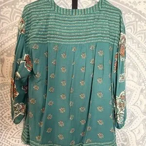 Chic teal blouse with floral accents. Features intricate patterns and relaxed fit.