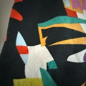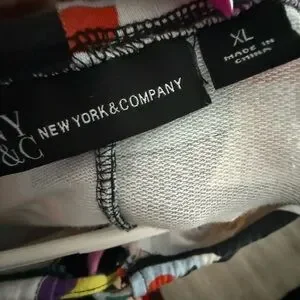 This colorful, abstract geometric print top is a NY&C (New York & Company) cropped zip-up jacket/sweatshirt. The design features a vibrant, multi-colored pattern reminiscent of 80s and 90s pop art styles. Very colorful and vibrant with tons of stretch and extra long sleeves.