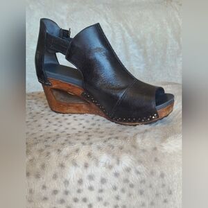 Elevate your look with these chic black leather and wood wedge sandals. Designed with a cool hole in the wedge, they are perfectly awesome.